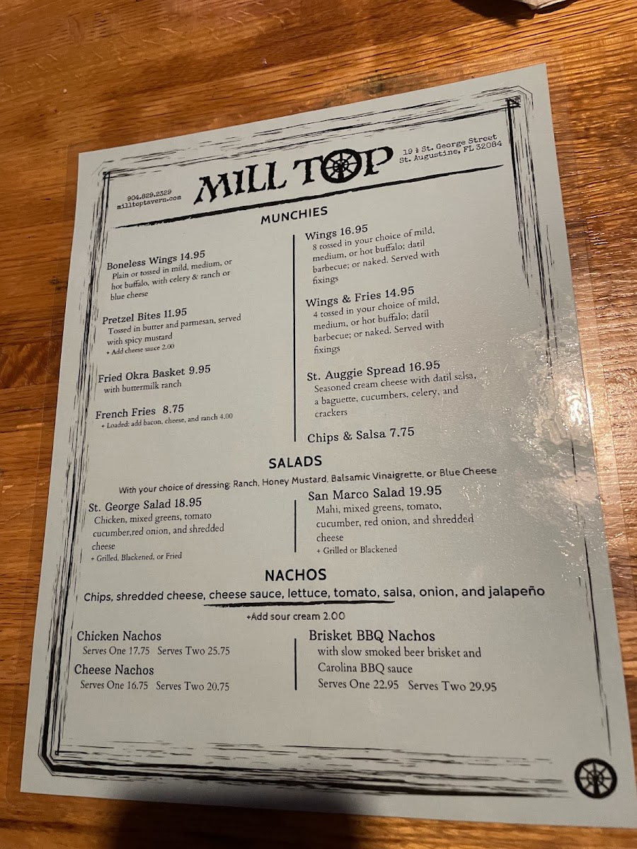 Welcome to Mill Top Tavern and Listening Room, a gem located in the heart of St. Augustine, FL, where flavors and melodies come together. This inviting tavern boasts a menu that highlights fresh local ingredients, featuring standout dishes like Mahi Tacos and Grilled Chicken Tacos, served with vibrant accompaniments including lettuce, cheese, and a chipotle aioli. For salad lovers, the St. George Salad with grilled chicken or the San Marco Salad with mahi provide refreshing options.